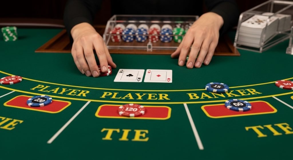 플레이어(Player)와 뱅커(Banker) 중 어느 쪽이 더 높은 숫자를 만들지 선택하는 형태입니다.
